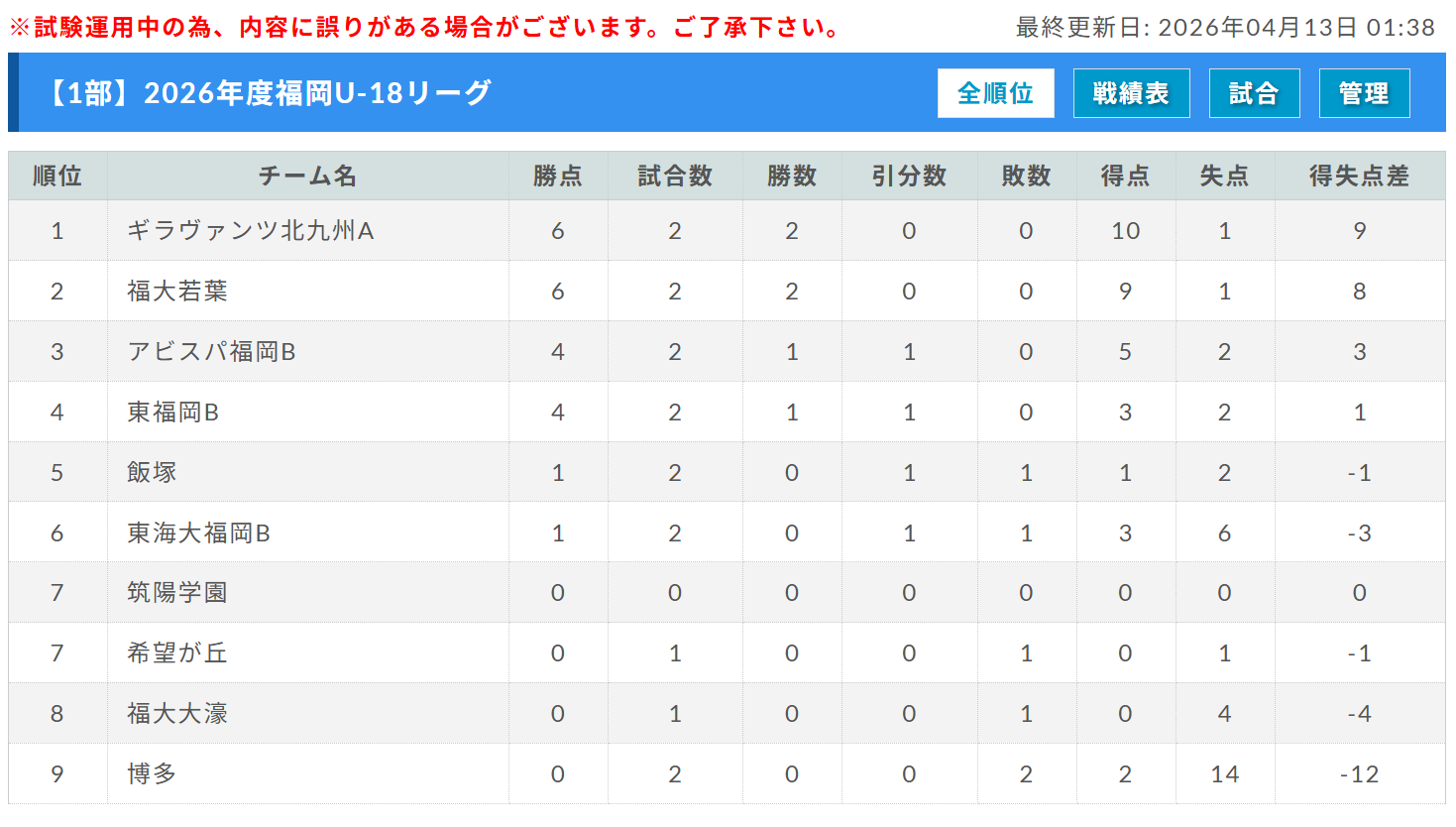 2部Aリーグ 4/12結果更新