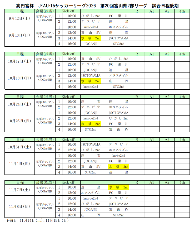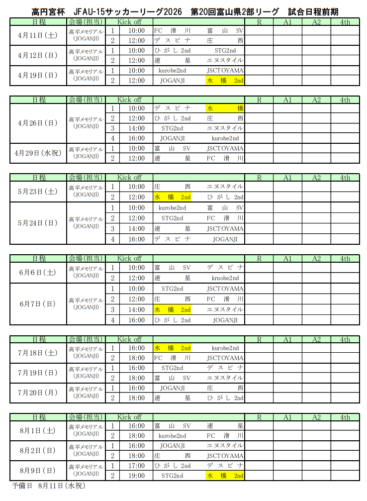 FC滑川、DespinaFC、庄西中学校、富山SV、ひがし2nd、速星中学校、エヌスタイル、STG 2nd、kurobe2nd、JOGANJI富山、水橋FC2nd、JSC TOYAMA