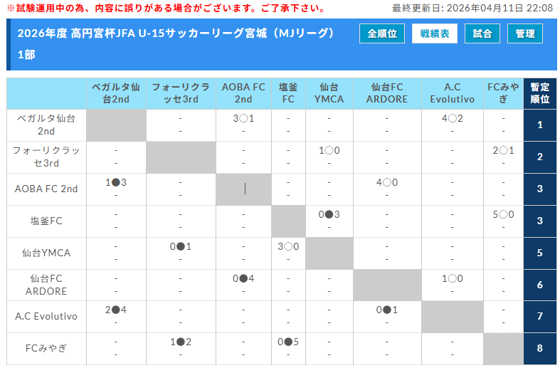 宮城U-15リーグの組み合わせ情報をありがとうございます!