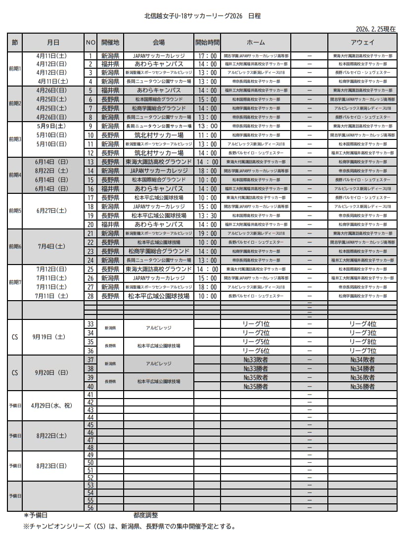 U-18女子サッカーリーグ2026 北信越