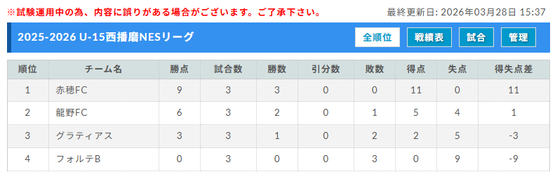 U-15西播磨NESリーグ 3/28更新 前期終了 赤穂FCが全勝首位で折り返し 後期はクラブユース選手権後