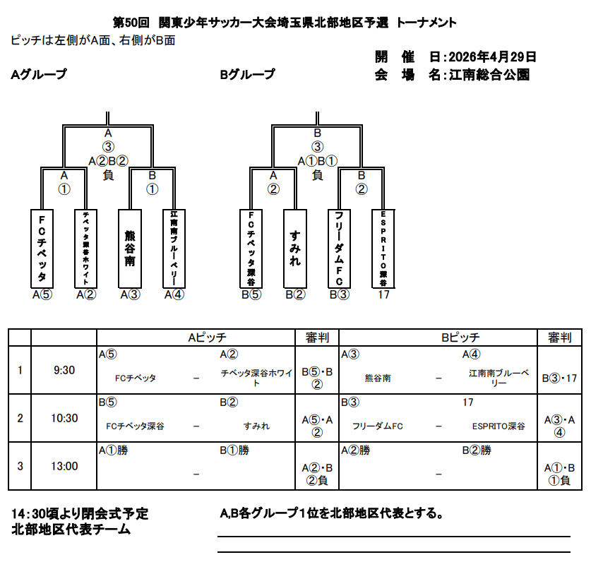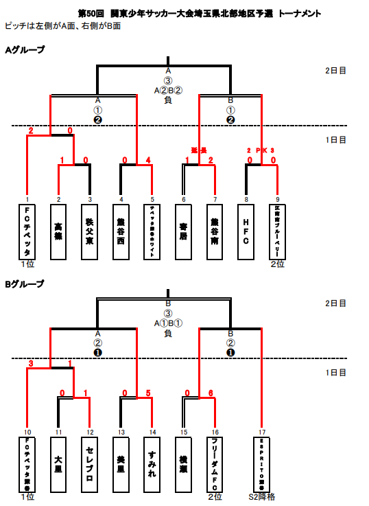 各トーナメント第1位の2チームを埼玉県予選の北部地区代表チームとする。