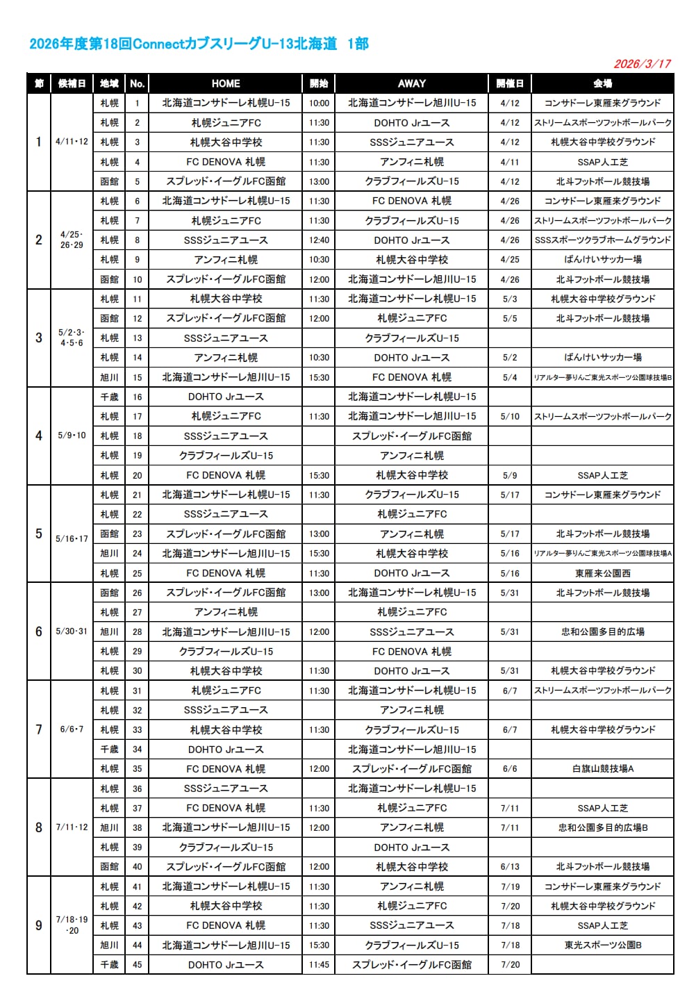 2026年度 第18回Connect カブスリーグ U-13 北海道