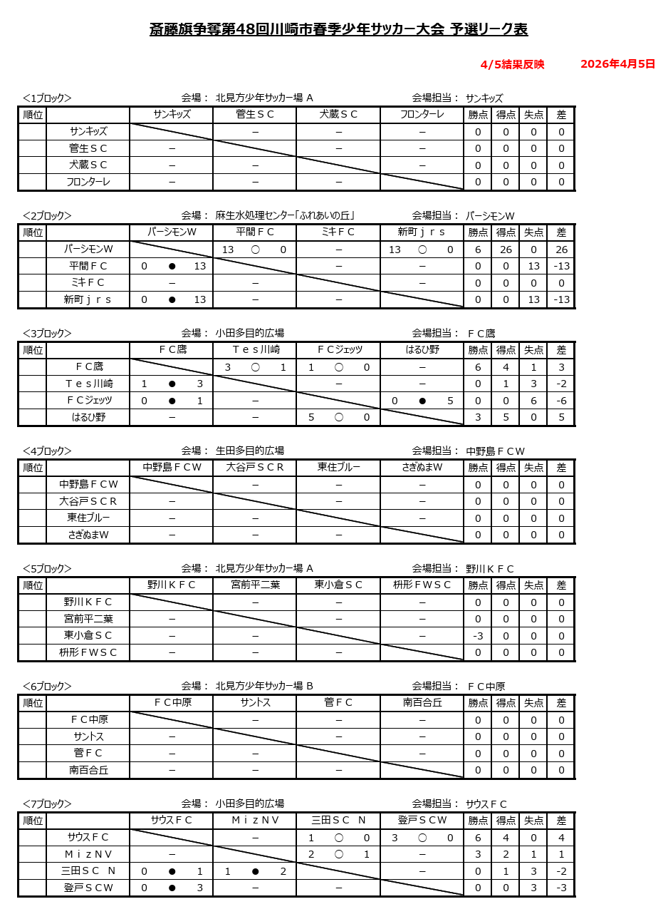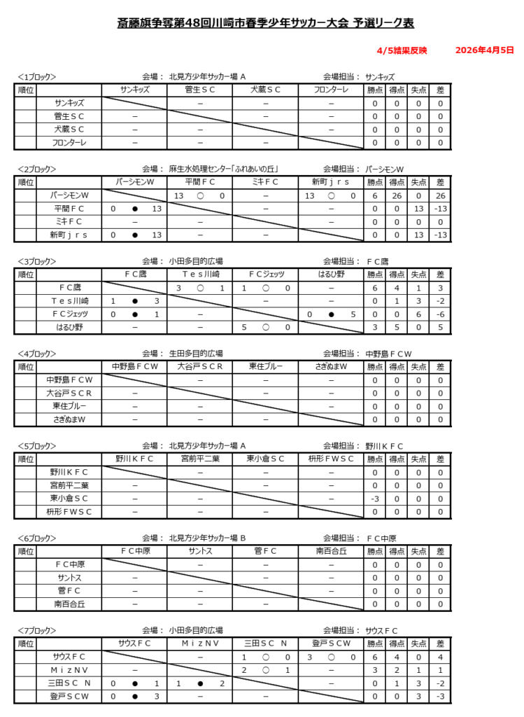 2026年度 斎藤旗争奪川崎市春季少年サッカー大会 (神奈川県)4/5結果掲載!