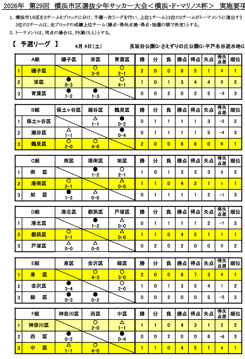 横浜市18区を3チーム6ブロックに分け、予選一次リーグを行い、上位1チームと2位の2チームがトーナメントに進出する。