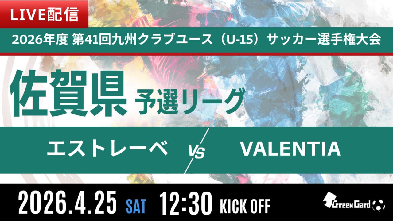2026年4月25日(土)に12時30分より行われる2026年度 佐賀県クラブユース(U-15)サッカー選手権大会 予選C エストレーベvsVALENTIAの試合がLIVE配信されます。