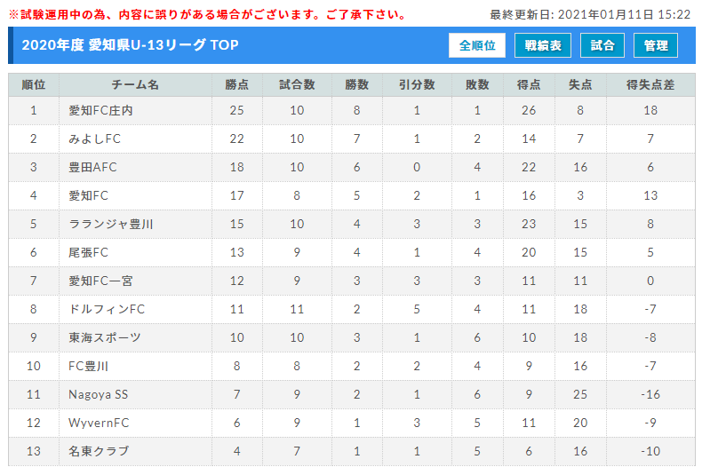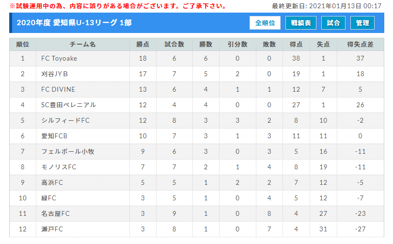 9月から開催されている「2020年度 愛知県U-13サッカーリーグTOP/1部/2部 」についてお知らせいたします。