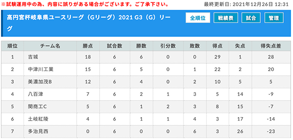 高円宮杯岐阜県ユースリーグ(Gリーグ)2021 G3(C)リーグ 12/5最終結果更新