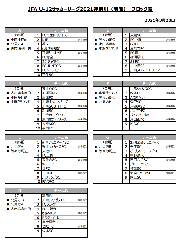川崎フロンターレU-12、バオムFC川崎、リバーFC、ミキFC、百合丘子どもSC、かじがやFC、向丘SC、FC鷹、南百合丘SC、KJF