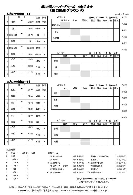(勝点が同一の場合、①得失点差・②得点・③直接対決の順とし、尚決しない場合は本部によるコイントスより順位を決定する。)